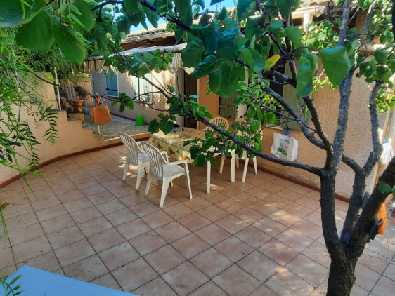 Au coeur du village, à proximités de la plage et des commodités, maison plain-pied traversante avec terrasse avant vue Mer et à l arrière terrasse et restanque arborée. De 73M² elle distribue une entrée principale par le séjour traversant, cuisine US semi équipée, dégagement, 3 chambres avec placard, SDD avec wc, wc indépendant, elle jouit d'un grand atelier au sous-sol ainsi qu'un garage fermé avec stationnement aisés devant celui-ci pour 2 à 3 véhicules. le terrain fait le tour de la maison sur une parcelle de 435M² aménagée et clôturés.
